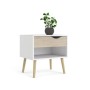 ha un cassetto con guide metalliche, con frontale colore rovere e maniglia ritagliata. Pratico vano contenitore nella parte inferiore. Eleganti gambe svasate in legno, e struttura di colore bianco Facile da montare e da pulire. Dimensioni 50,2 x 39,1 x h 49,7 cm.