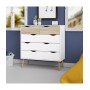 con finitura laccato bianco, dotata di 3 spaziosi cassetti + 2 cassetti finitura rovere naturale e gambe svasate in legno. Ha guide per cassetti in metallo di facile scorrimento e una superficie durevole e antigraffio. Facile da montare e da pulire. Dimensioni 98,7 x 39,1 x h 100,9 cm