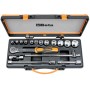 Art. 920 AC 12 esagonali e 5 accessori. Attacco composto da - 12 bussole esagonali 10 - 11 - 12 - 13 - 14 - 17 - 19 - 22 - 24 - 27 - 30 - 32 mm - 1 prolunga 1/2 da 125 mm - 1 prolunga 1/2 da 255 mm - 1 snodo 1/2 - 1 quadro maschio 1/2 con spina scorrevole - 1 cricchetto semplice 1/2 con quadro scorrevole. Cassetta in lamiera. Dimensioni 420 x 185 x 60 mm. Peso 4,2 kg.