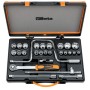 Art. 920 BC 21 esagonali e 6 accessori. Attacco composto da - 21 bussole poligonali 10 - 11 - 12 - 13 - 14 - 15 - 16 - 17 - 18 - 19 - 20 - 21 - 22 -23 - 24 - 25 - 26 - 27 - 28 - 30 - 32 mm - 1 prolunga 1/2 da 125 mm - 1 prolunga 1/2 da 255 mm - 1 snodo 1/2 - 1 quadro maschio 1/2 con spina scorrevole - 1 manovella - 1 cricchetto semplice con quadro scorrevole 1/2. Cassetta in lamiera 420 x 280 x 60 mm. Peso 6,5 kg.