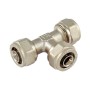 raccordo a T in ottone nichelato. A stringere. Per tubi multistrato, pressione max di esercizio 10 bar. Diametro 16x2 - 16x2 - 16x2 mm. Temperatura di esercizio max 95 C min -20 C.