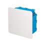 in tecnopolimero antiurto. Centri di foratura 68 mm integrati nel fondo delle scatole. Viti di fissaggio alla parete e inserti di bloccaggio in acciaio zincato anticorrosione. Installazione in pareti cave prefabbricate in gesso o legno. Completa di coperchio con fissaggio a vite. Dimensioni 120x100x50 mm. Colore blu.